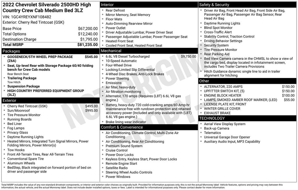 While we make every effort to ensure the information listed here is accurate, there may be instances where some of the factory incentives, pricing, options or vehicle features may be listed incorrectly as we get data from multiple data sources. Please confirm the details of this vehicle and the incentives you may or may not qualify for with the dealer to ensure its accuracy. Selling price may vary from MSRP as dealer sets selling price, please ask dealer for details on adjustments or discounts. Additionally, the advertised price does not reflect the final selling price. It does not include state sales tax, vehicle registration fees, finance charges, any other fees required by law, market adjustments or discounts, and/or document preparation fees. Dealer cannot be held liable for incorrectly listed information and reserves the right to change pricing, discounts, or rebates that are shown. We do not reserve or hold advertised vehicles, all are subject to prior sale on a first come first serve basis. Customer must take delivery of the vehicle and execute all required documentation at dealership. All vehicle pricing expires upon close of business the same day.